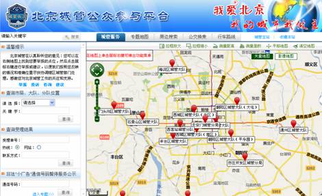 专题服务模块提供北京市城管执法局及所有区县大队、分队的地址、电话及地理位置信息及相关城市管理资源的查询功能。